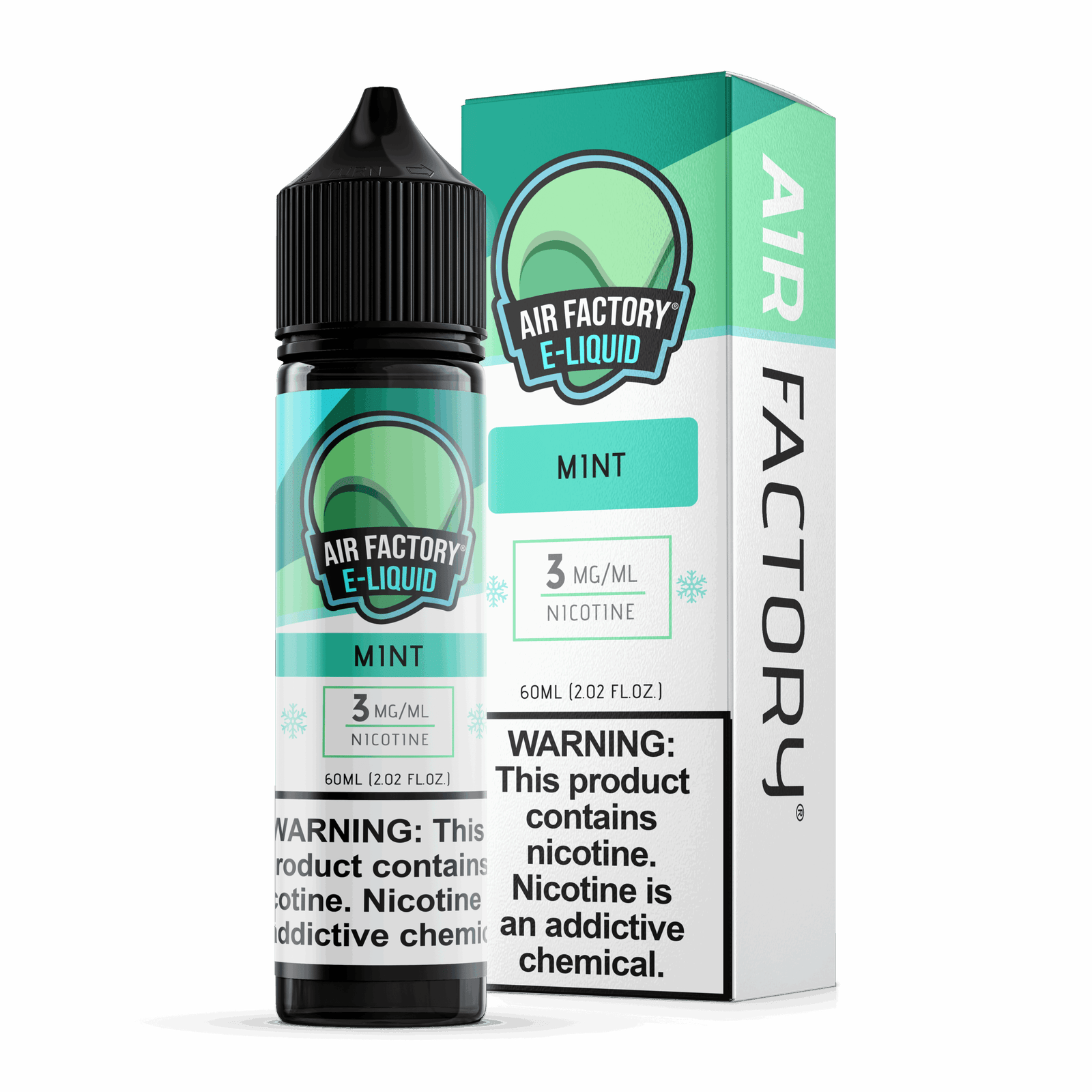 The Air Factory Mint 60ml bottle is a standard cylindrical shape, made of durable plastic. The dimensions are approximately (provide dimensions here). WARNING: This product contains nicotine, which is an addictive substance. Keep out of reach of children and pets. This product is intended for use by adults only. Consult with your physician before use, especially if you have pre-existing health conditions.