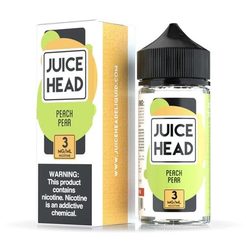Juice Head Peach Pear comes in a standard 100ml bottle, made from durable, child-resistant plastic. The bottle is designed for easy pouring and features clear labeling detailing the flavor profile, VG/PG ratio, and nicotine strength.
