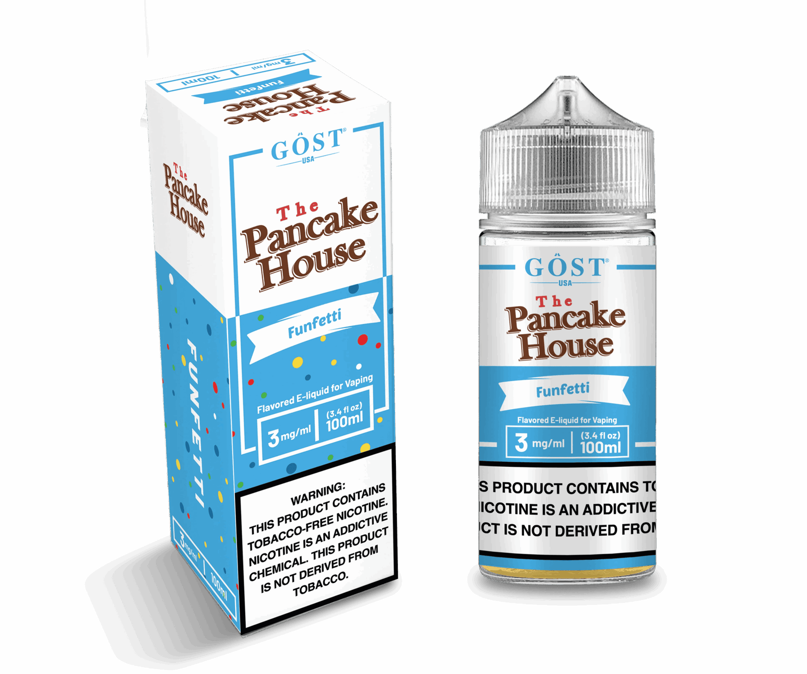 The Pancake House Funfetti e-liquid comes in a standard 100ml bottle. The bottle is made of durable plastic designed to prevent leakage. Dimensions: (Insert dimensions here)