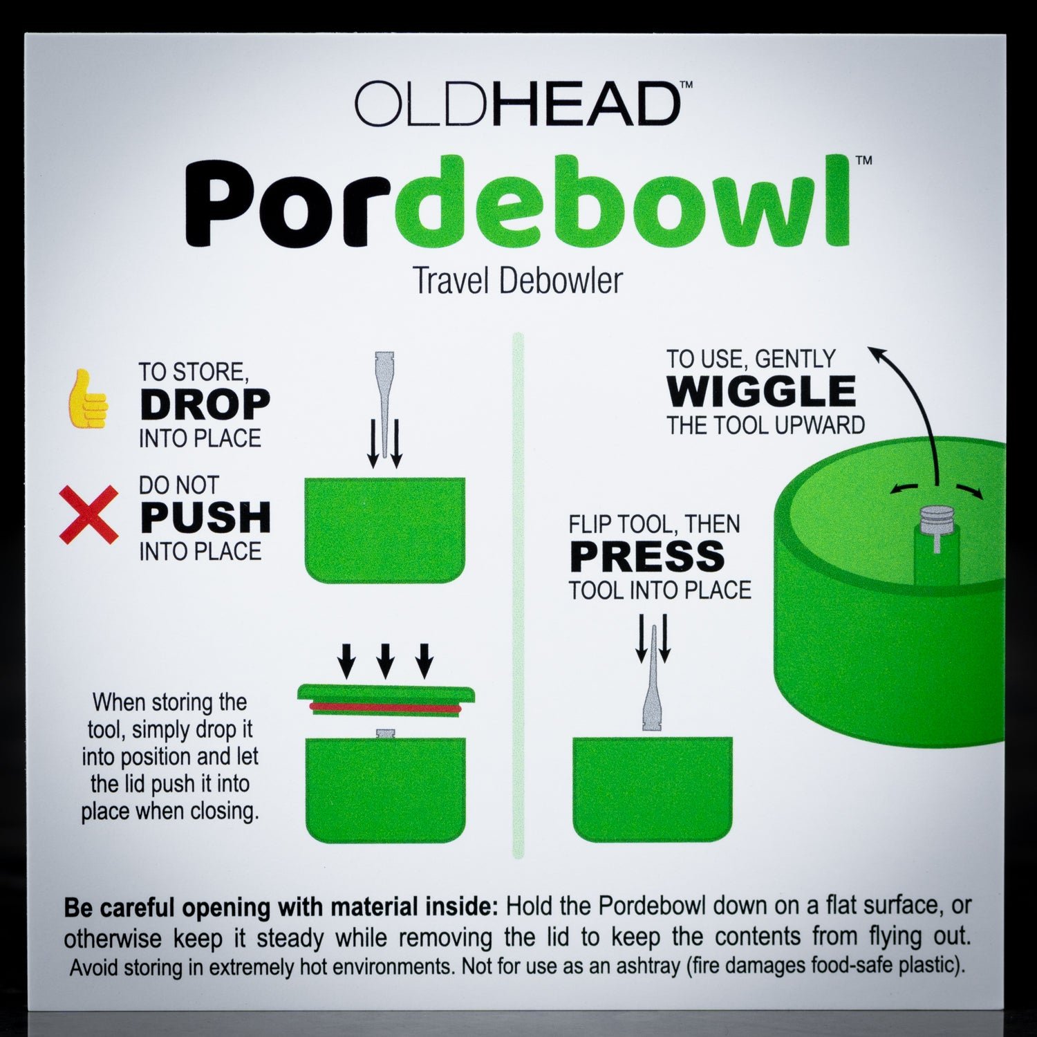 To set the pordebowl up, simply remove the lid, pull out the stainless steel debolwing tool and insert the debowling tool back in the hole with the spike pointing upwards. This debowling tool can also be used as a tamping and stirring tool.