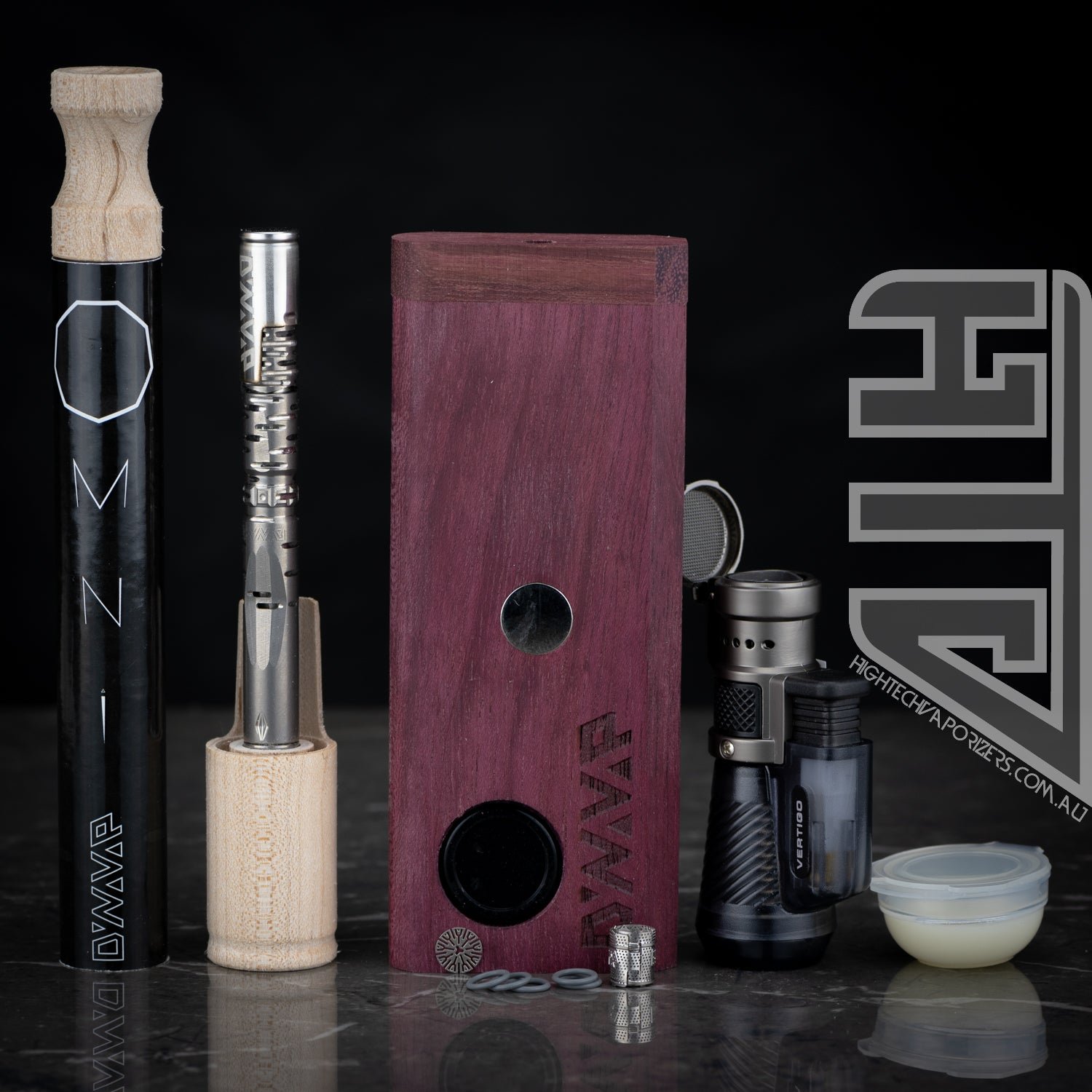 The OMNI kit with DynaCoil includes the flagship OMNI, Purpleheart Dynastash XL ER, Vertigo Triple Flame Torch, a DynaCoil, Spare High Temp O-Rings, Spare Titanium CCD and a tub of dynawax.