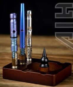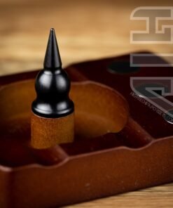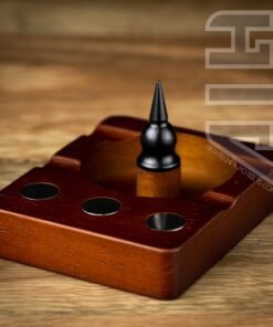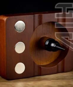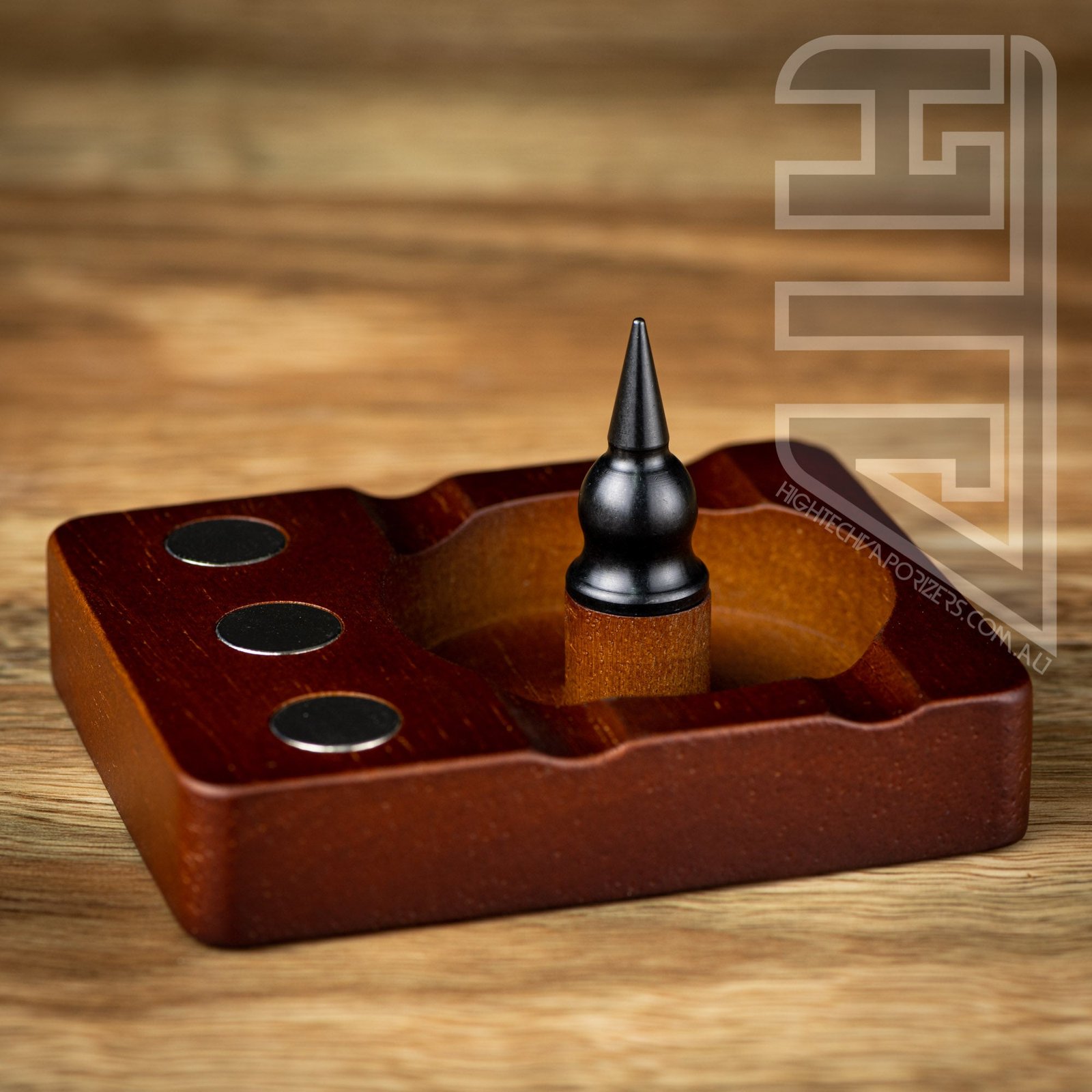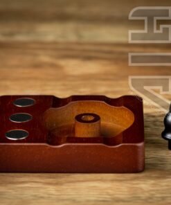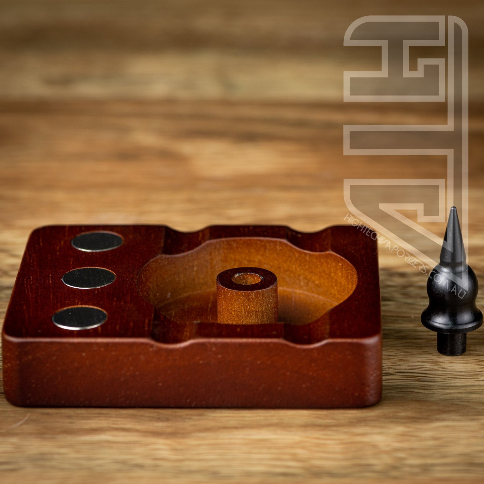 Built for use for Dynavap and other like devices. This wooden debowler stand has 3 magnets imbedded into the wood for holding your dynavaps and for removing dynavap caps. In the centre of the spent herb dish is a solid steel spike which helps dig out spent herb.
